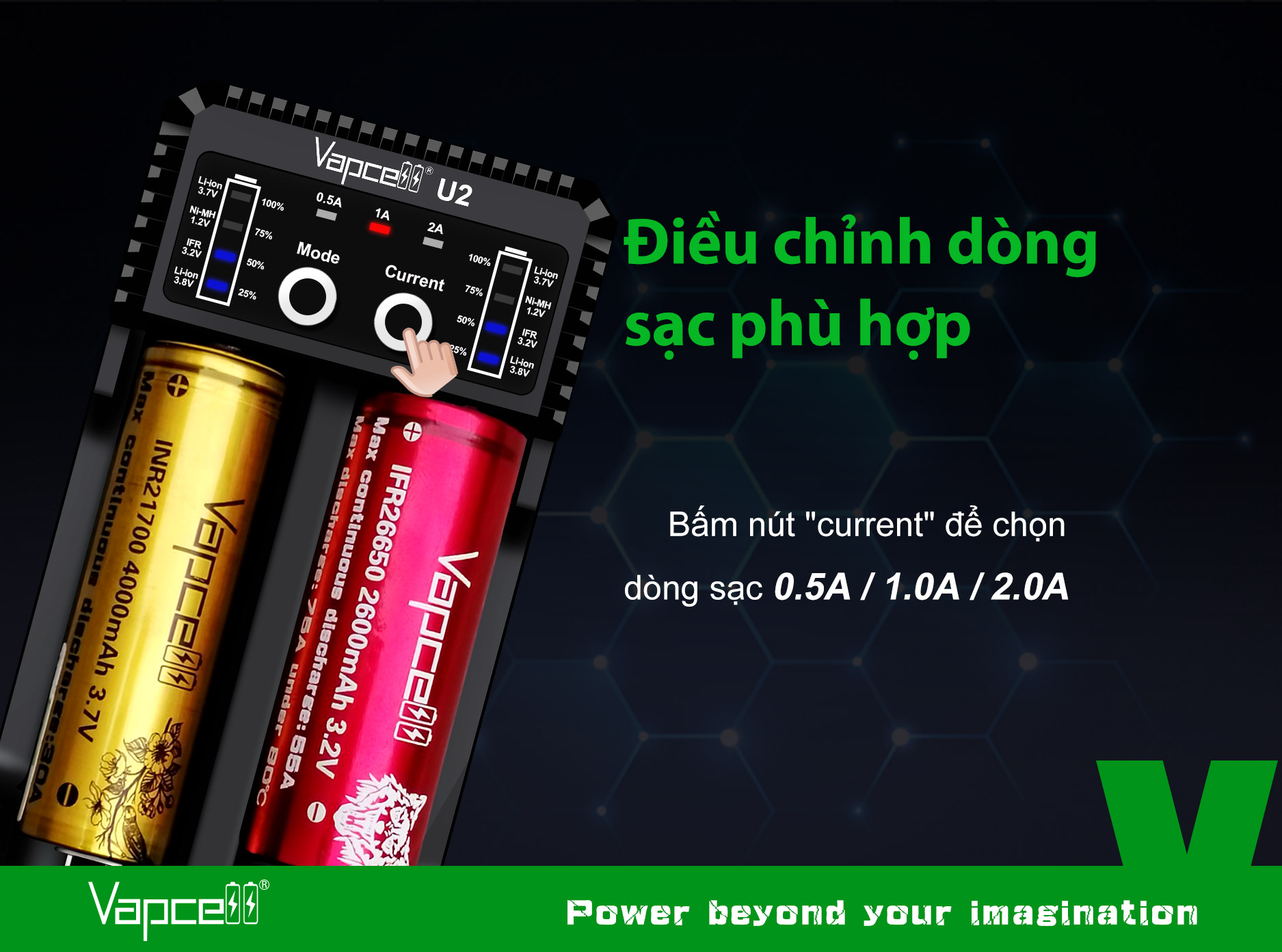 Vapcell U2 được trang bị vi xử lý thông minh, tự động nhận dạng các loại pin như Li-ion, Ni-MH, Ni-CD, và người dùng cũng có thể chọn thủ công chế độ sạc cho pin LiFePO4.